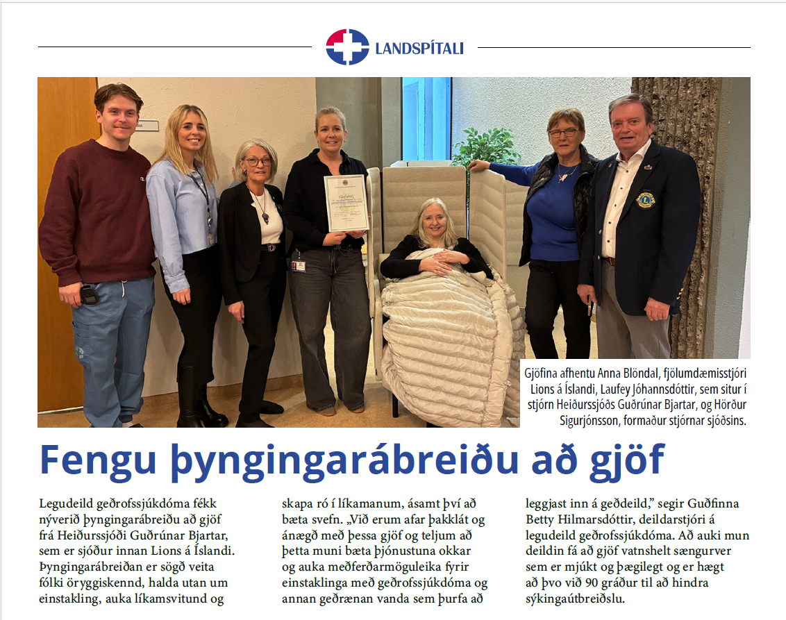 Í þakkarbréfinu segir: Þyngingarábreiðan og sængurverið, sem þið færðuð okkur, eru nú komin í notkun á deildinni og hafa vakið mikla ánægju bæði meðal sjúklinga og starfsfólks. Þessi viðbót styður vel við það meðferðarstarf sem unnið er hér á deildinni og mun án efa nýtast okkur vel um ókomin ár.Við viljum einnig deila með ykkur gleðitíðindum: í fréttabréfi Landspítala, Spítalapúlsinum, birtist frétt um gjöfina ykkar, þar sem þið eigið sannarlega skilið lof og þakklæti fyrir ykkar góðverk og stuðning við spítalastarfið. Afrit af fréttabréfinu fylgir hér með.Við sendum ykkur innilegar þakkir og hlýjar kveðjur. Ykkar gjafmildi er okkur öllum hvatning í daglegu starfi.